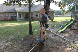 Jack turned five yesterday and has been asking me all day today exactly what he is now able to do as a five year old...well after digging through my closet, I told him I thought a 5 year old should be able to play on an adventure course....SO...one retired cut-up climbing rope...one tied swiss seat harness...and two carabiners (post wiping off all the dust) later we had ourselves a blast!!! He was awesome! Welcome to 5 Jack!