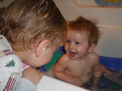 Jack was finishing his bath last night when Aimee decided to throw Maggie in the mix. It continues to amaze me how much she has grown! She thoroughly enjoyed her time in the tub and continues to frighten Aimee and me with her daring and lack of fear. I had her on the bed after the bath and she bolted for the edge. Looks like the next few months are going to be a little interesting.